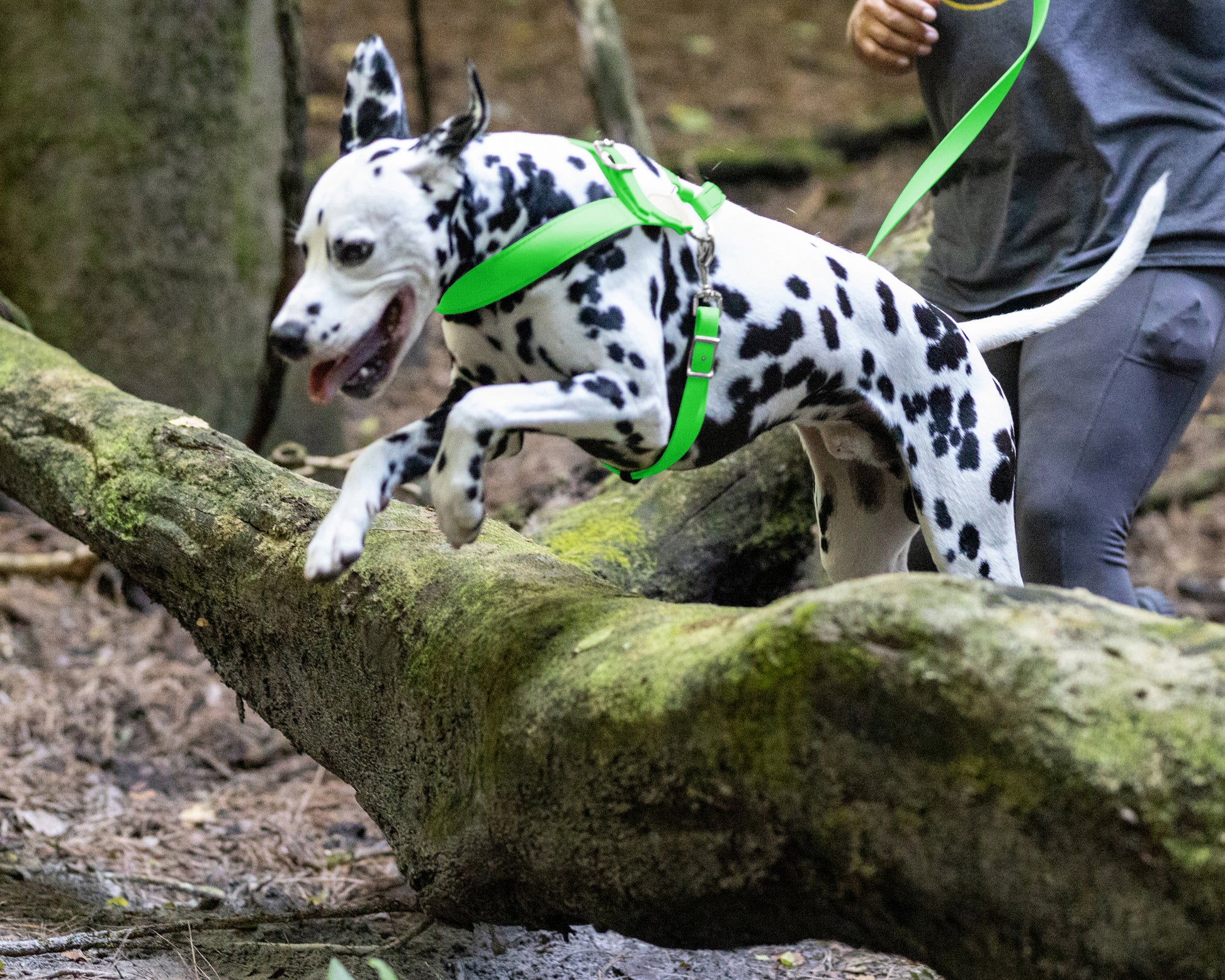 Our dog roading harness is made from beta biothane and is padded with neoprene at the chest for extra comfort. This harness is one size fits all and is designed to adjust easily between different dogs.